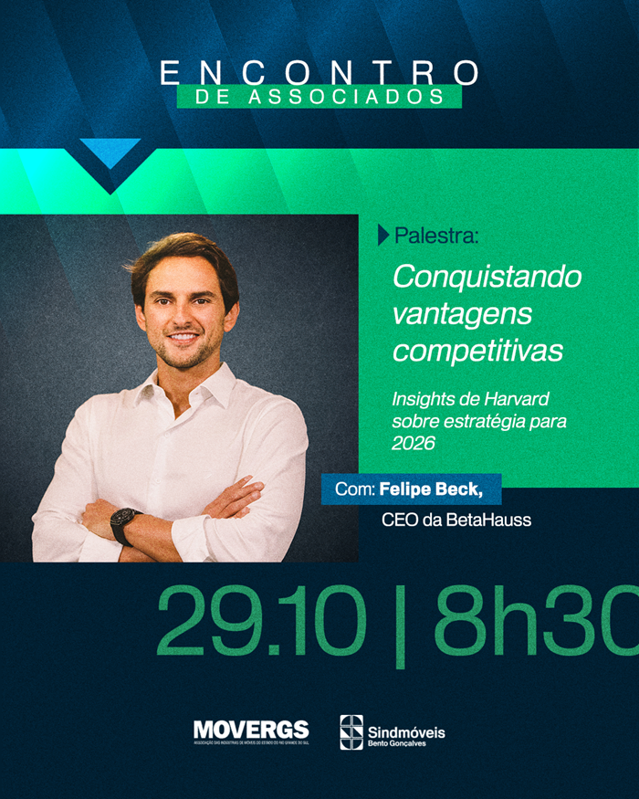 O próximo Encontro com Associados Movergs/Sindmóveis será com Felipe Beck, CEO da BetaHauss, consultoria que já ajudou gigantes como Dell, Sicredi, Grupo Boticário, iFood e Stihl a definirem estratégias de crescimento. Com insights de Harvard, o especialista apresentará caminhos para empresas que desejam fortalecer resultados e construir uma estratégia sólida para 2026. Dia 29.10 (quarta-feira), às 8h30, na sede das entidades (rua Avelino Luiz Zat, 95, 3º andar).