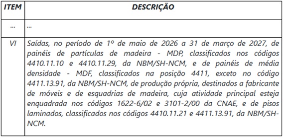 A principal mudança estabelece novas condições para a saída de produtos como painéis de partículas de madeira (MDP) e painéis de média densidade (MDF), quando destinados a fabricantes de móveis e esquadrias de madeira. O benefício se aplica apenas a produtos de produção própria e destinados a empresas cuja atividade principal esteja enquadrada em códigos específicos da Classificação Nacional de Atividades Econômicas (CNAE).